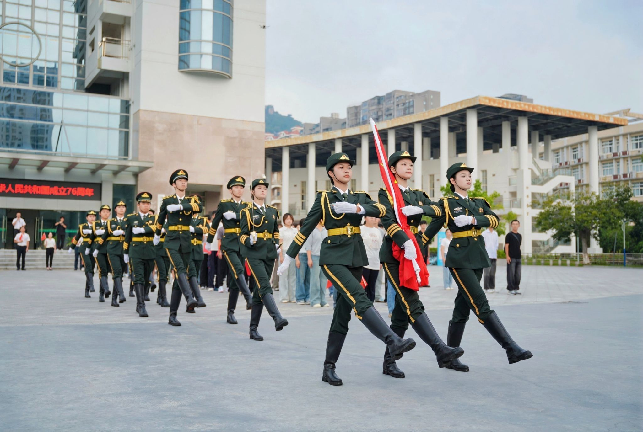 上午八时整,隆重举行升旗仪式。国旗护卫队迈着铿锵有力的步伐,护卫五星红旗庄严入场。伴随着《义勇军进行曲》响起,全体师生面向国旗肃立行注目礼,齐声高唱国歌。